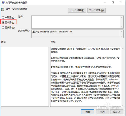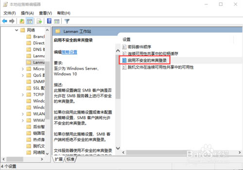 5、當(dāng)然對于安全性要求不是太高的小伙伴也可以通過降低安全性來提升共享兼容能力。按Win+R,輸入gpedit.msc,打開“計算機配置-管理模板-網(wǎng)絡(luò)-Lanman工作站”,雙擊右側(cè)“啟用不安全的來賓登錄”,選擇“已啟用”并確認(rèn),重啟。