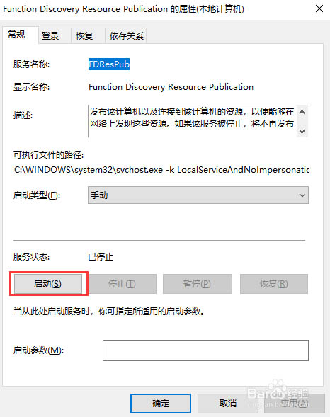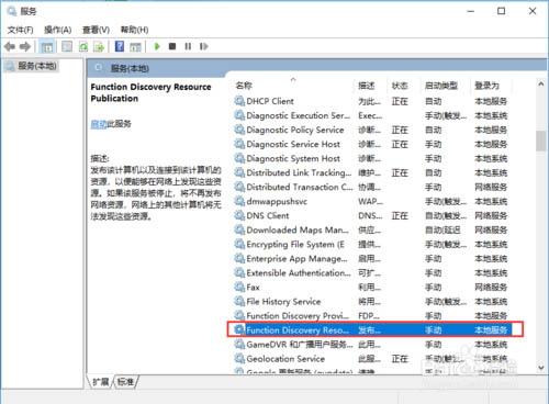3、這樣設(shè)置后,其他電腦應(yīng)該就能看到這臺共享電腦了。要是還不行的話,就需要進一步打開共享服務(wù)了。按Win+R后輸入services.msc。在右側(cè)找到“Function Discovery Resource Publication”并雙擊,點擊“啟動”。