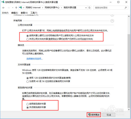 2、點擊“高級共享設(shè)置”,在“所有網(wǎng)絡(luò)”標(biāo)簽下,勾選“公用文件夾共享”的第一個選項以及“密碼保護的共享”中的第一個選項,保存更改。