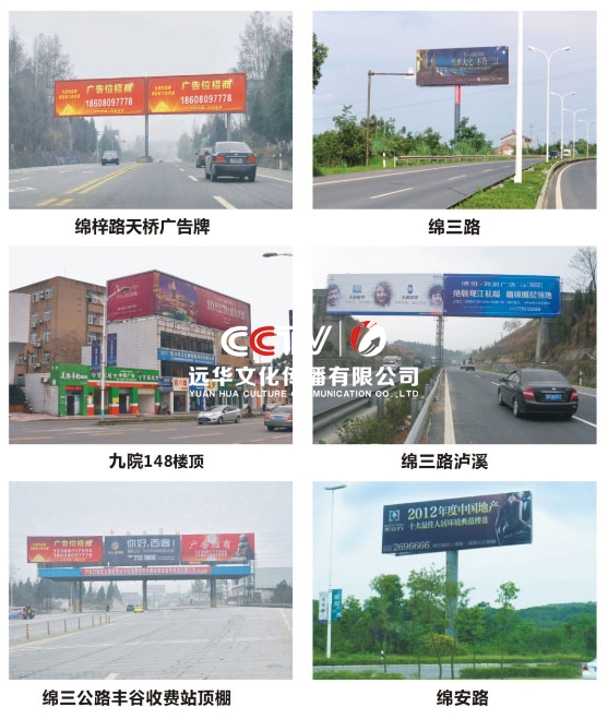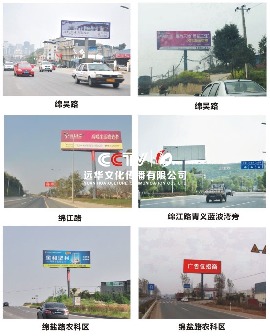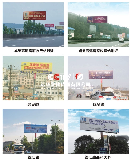 公司擁有單立柱及戶外大牌100余個(gè),分布在成綿高速磨家收費(fèi)站、綿鹽路、綿三路、綿江路、綿梓路、綿陽農(nóng)科區(qū)、綿安路、科學(xué)城、二環(huán)路等。可應(yīng)客戶需求建立、審批、發(fā)布戶外單立柱廣告牌。