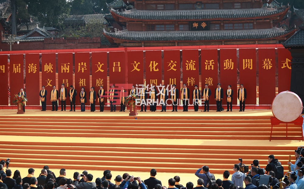 開幕式后,沿襲古老的廟會(huì)習(xí)俗,三通圣鼓,七曲山大廟正門徐徐開啟,己亥年文昌祭祀大典拉開帷幕。兩岸嘉賓及廣大信眾、游客,身披綬帶,肅立注目,共同參與祭祀,共同見證華夏兒女一脈相承的文化信仰。
