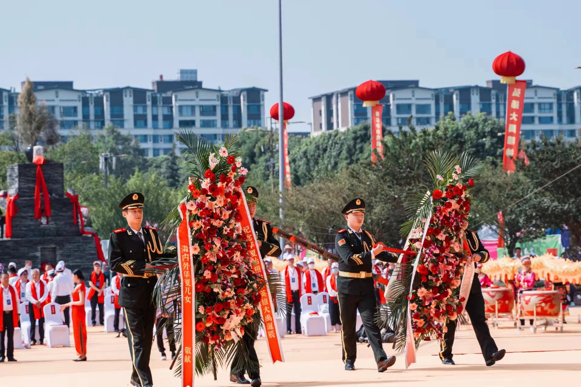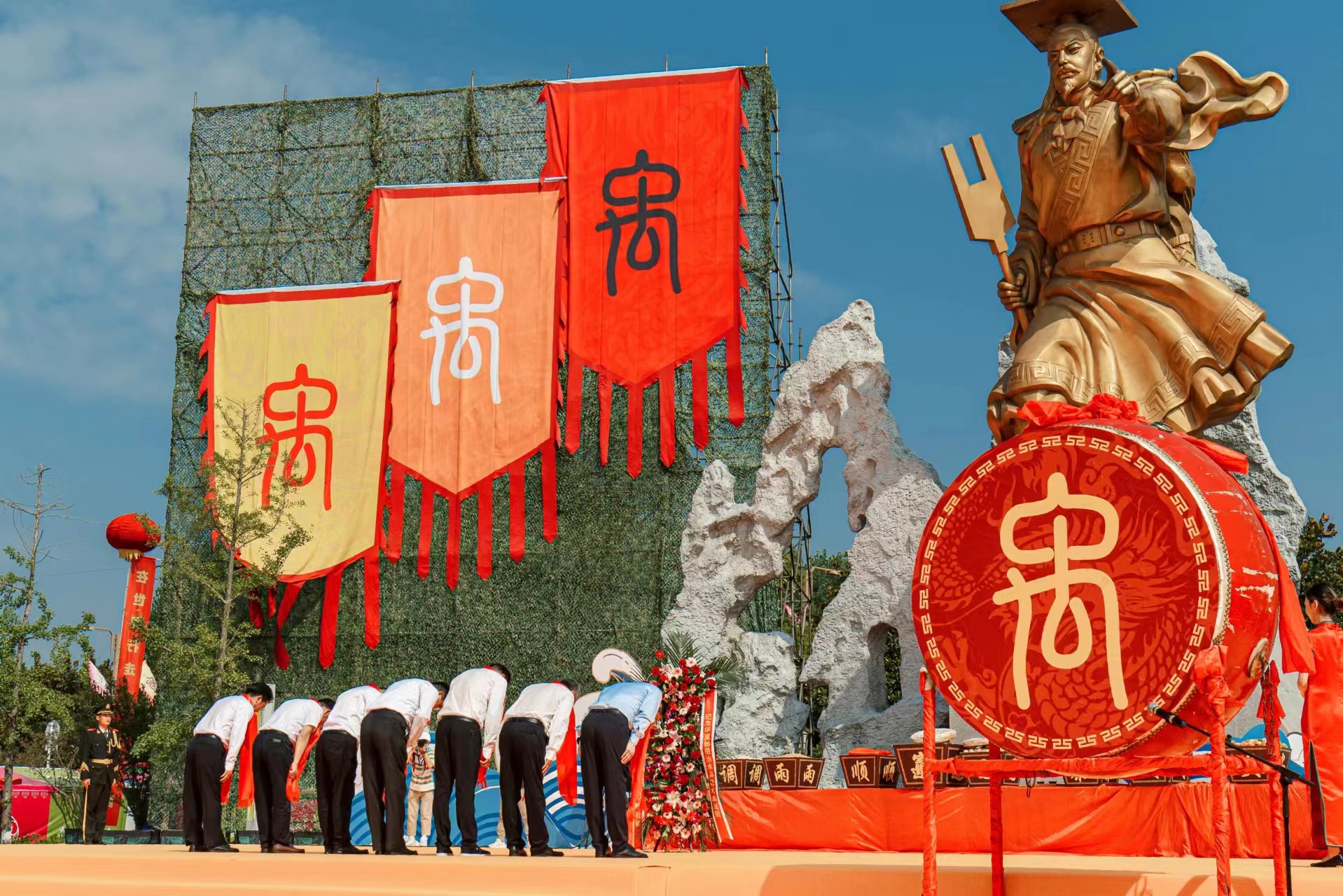 今天上午九時(shí)十五分,第四屆海峽兩岸大禹文化交流活動(dòng)在北川新縣城禹王廣場(chǎng)開(kāi)幕。九時(shí)五十分,簡(jiǎn)潔莊重祭祀典禮隆重開(kāi)啟,鳴銃9響,擊鼓撞鐘,代表14億炎黃子孫的共同敬意以及對(duì)神州大地國(guó)泰民安的美好祝愿。隨后,現(xiàn)場(chǎng)逐一開(kāi)展向大禹敬獻(xiàn)花籃、敬獻(xiàn)羌紅,恭讀祭文、行禮、頌歌獻(xiàn)舞等流程,現(xiàn)場(chǎng)華夏兒女全體肅立,手持羌紅、面向大禹行禮祭拜。